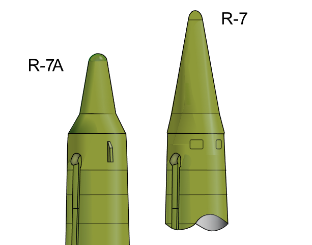 Сравнительное изображение головных частей МБР Р-7А / 8К74 и Р-7 / 8К71, wikimedia.org Испытания зарядов типа "изделие 49":