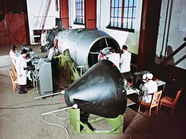 Подготовка к испытаниям (осень 1961 г.): испытания планировалось провести сбросом бомбы с самолета-носителя на полигон на о.Новая Земля. Супербомба была разработана и изготовлена в рекордно короткий срок в двух экземплярах: контрольное изделие (для генеральной репетиции экипажа самолета, измерительных систем полигона) и его боевой вариант. Понимая, что испытание супербомбы ухудшит экологическое состояние северных регионов, в первую очередь Скандинавских стран, было предложено испытать заряд, составляющий в «чистом» исполнении 50% от максимальной мощности (т. е. 50 Мт). В конструкции самой супербомбы и ее заряда было применено большое число серьезных новшеств. Мощный термоядерный заряд был выполнен по «бифилярной» схеме: для радиационной имплозии основного термоядерного блока с двух сторон (спереди и сзади) были размещены два термоядерных заряда для обеспечения синхронного (с разновременностью не более 0,1 мкс) поджига термоядерного «горючего». КБ-25 (ВНИИА) доработало для этого заряда серийный блок автоматики подрыва. Проведенных на ЭВМ расчетов для А.Д. Сахарова показалось недостаточно. «За 2-е суток до отправки на полигон изделия в 8 часов вечера Сахаров пришел в цех, подошел к изделию (корпус бомбы был открыт и доступ к заряду был обеспечен с обеих сторон). Андрей Дмитриевич заглянул внутрь, пощупал конструкцию, потом сел в углу на стул и задумался в позе роденовского «Мыслителя». Так он просидел до 12 ночи, потом попросил лист чистой бумаги. Поскольку в цехе бумаги не оказалось, предложили ему чистый лист фанеры. На этой фанерке академик нарисовал эскиз, где предлагалось со стороны зарядов-инициаторов на внутренней конусной поверхности корпуса заряда установить свинцовые пояса толщиной 60 мм. Я звоню в час ночи директору КБ-11 Музрукову Б. Г.: «Что делать, через 36 часов отправка?» Ответ: «Делайте, как сказал Сахаров!». В 6.00 утра в цехе конструкторы рисуют «белки» и через 4 часа свинцовые пояса готовы (из воспоминаний начальника сборочного цеха завода КБ-11 А. Г. Овсянникова). Через 40 лет, когда по заданию директора и первого заместителя научного руководителя ВНИИЭФ академика РАН Илькаева Р.И. в мощнейшем в России вычислительном центре ВНИИЭФ были проверены расчеты по трехмерной задаче «Мимоза», подтвердилось, что отсутствие этих свинцовых поясов привело бы к существенному искажению сферы радиационной имплозии и снижению мощности взрыва на ~ 80%. Так мысль академика оказалась намного совершеннее доступных по тому времени ЭВМ.  Покрытие самолета-носителя Ту-95-202 светоотражающей краской (кадры архивного видео ВНИИЭФ). Подготовка изделия АН602 к сбросу велась на базе Дальней Авиации Оленья около пос.Высокое рядом с Оленегорском Мурманской области. Командир экипажа носителя Ту-95-202 майор А.Е.Дурновцев. Испытательный сброс бомбы с термоядерным взрывом выполнен 30 октября 1961 г. Сброс произошел на высоте 10,5 тыс. м, взрыв — на высоте 4 км в районе пролива Маточкин Шар на Новой Земле. Мощность взрыва составила 52,5 Мт тротилового эквивалента. Научный руководитель проекта А.Д.Сахаров за успешное испытание получил третью звезду Героя Социалистического труда СССР.